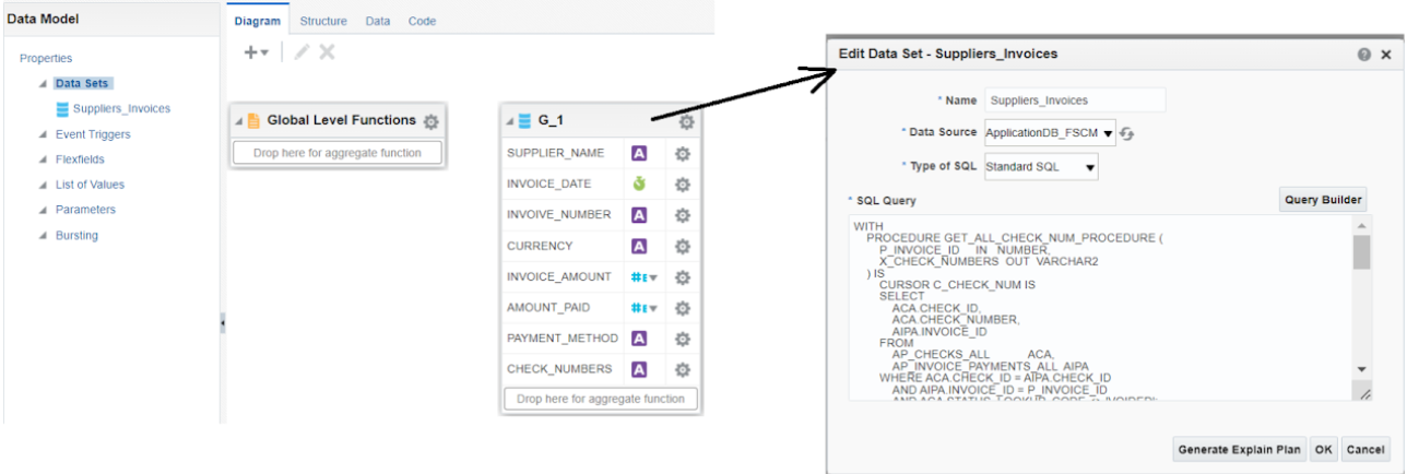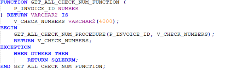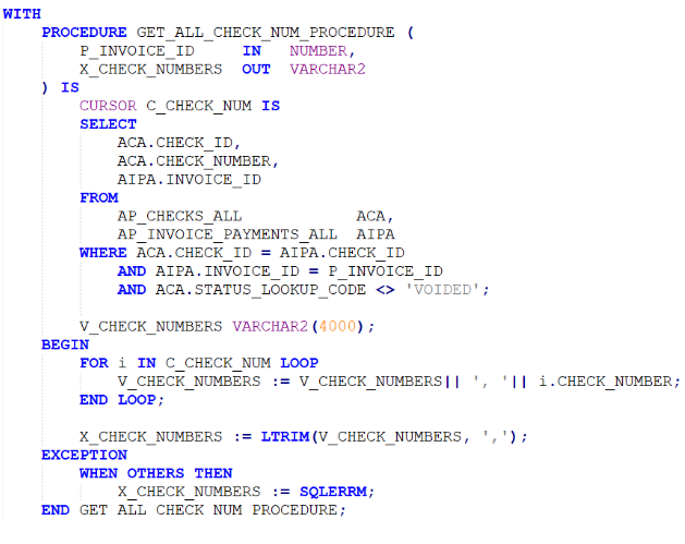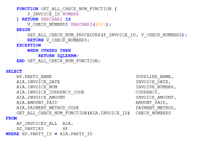 In this example we will create a PL/SQL Procedure to get all the Payment Numbers which are paid against the invoice, and we will create a PL/SQL Function to call the above Procedure and return the all the Payment Numbers in a single column.