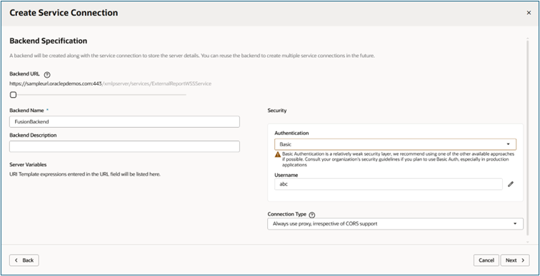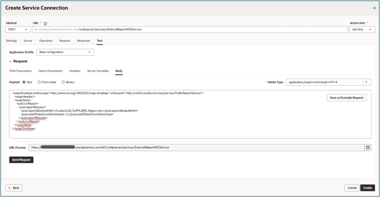 • URL: Paste the endpoint from SOAP UI: https://<your_fusion_url>:443/xmlpserver/services/ExternalReportWSSService