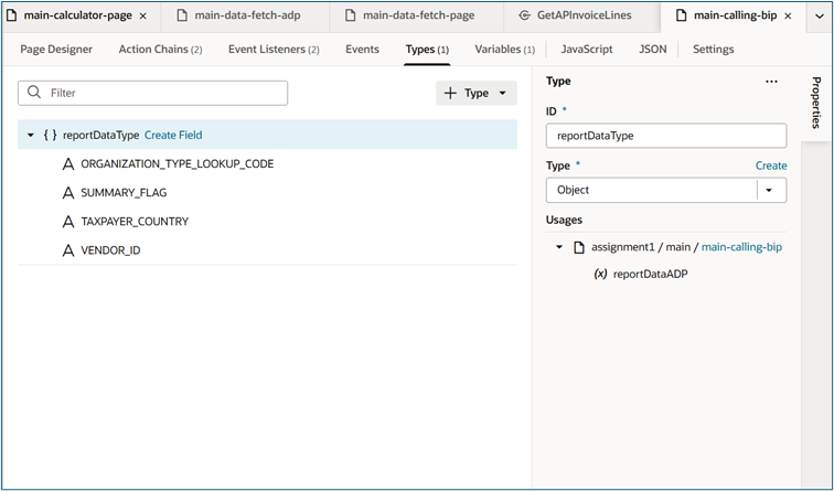• In Types tab (page or app scope) → + Type → Custom.
